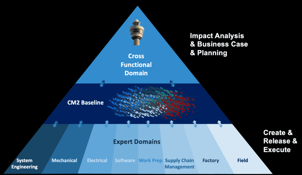 In the middle, you see the CM2 Baseline that connects all these different domains together using a semantic common data model. It connects data from across domains and tools to create a holistic 360 view of your product. Essentially, a social media profile for each product and its components.