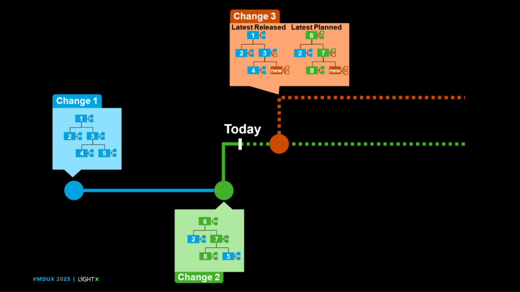 With the CM2 Baseline, you can see the past, present, and future. Instead of only looking at a star and seeing its past, you see the current state. In this example, you can see that I have a baseline today based on the released Change 1. I have planned Change 2, which will replace parts 1, 3, and 4 with parts 6, 7, and 8, respectively. And I am analyzing the impact of replacing part 5 with a new part in Change 3. If, as we have always done, we do an impact analysis against the latest released, you would mark part 3 as impacted and requiring a BOM change.